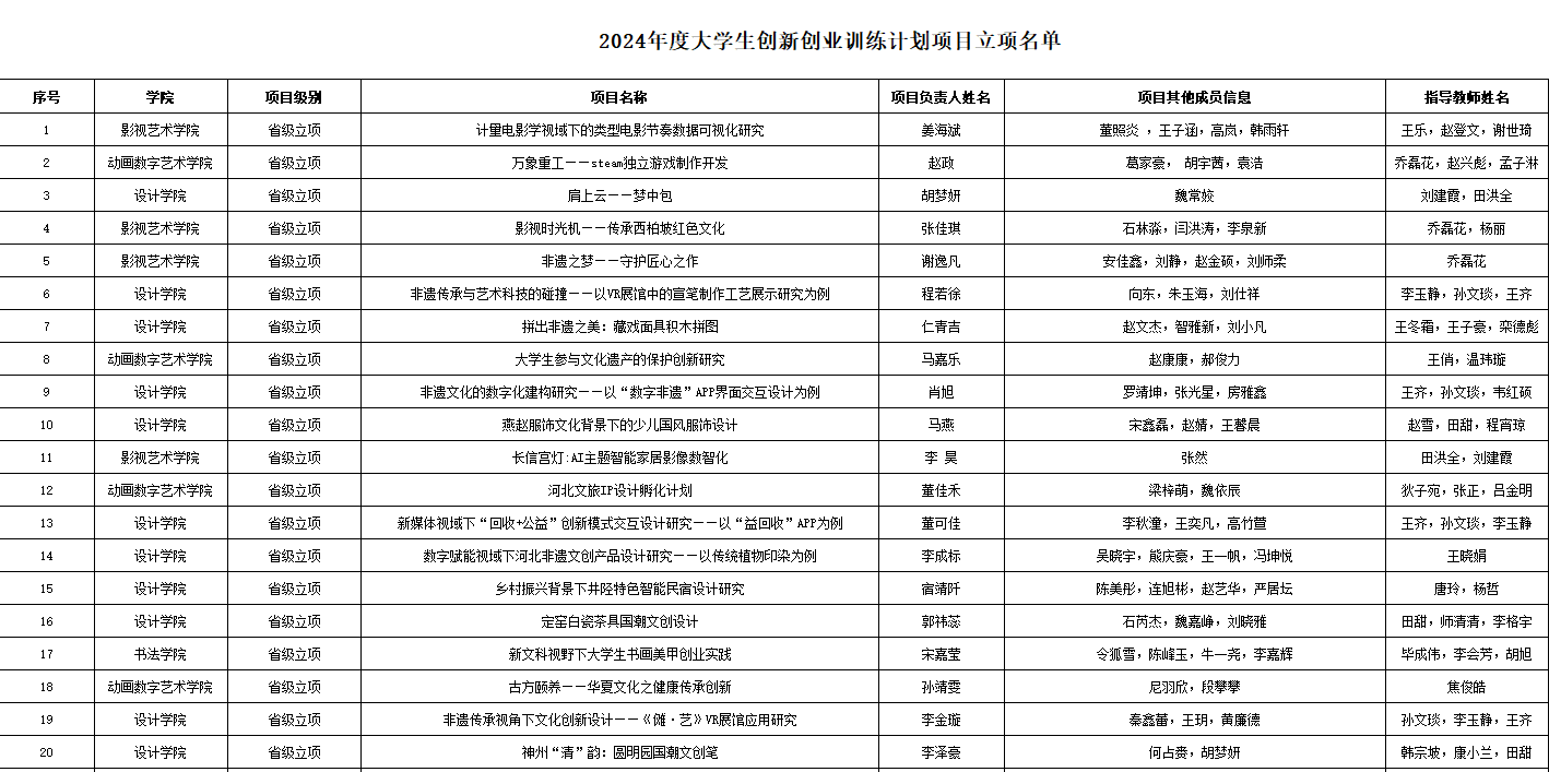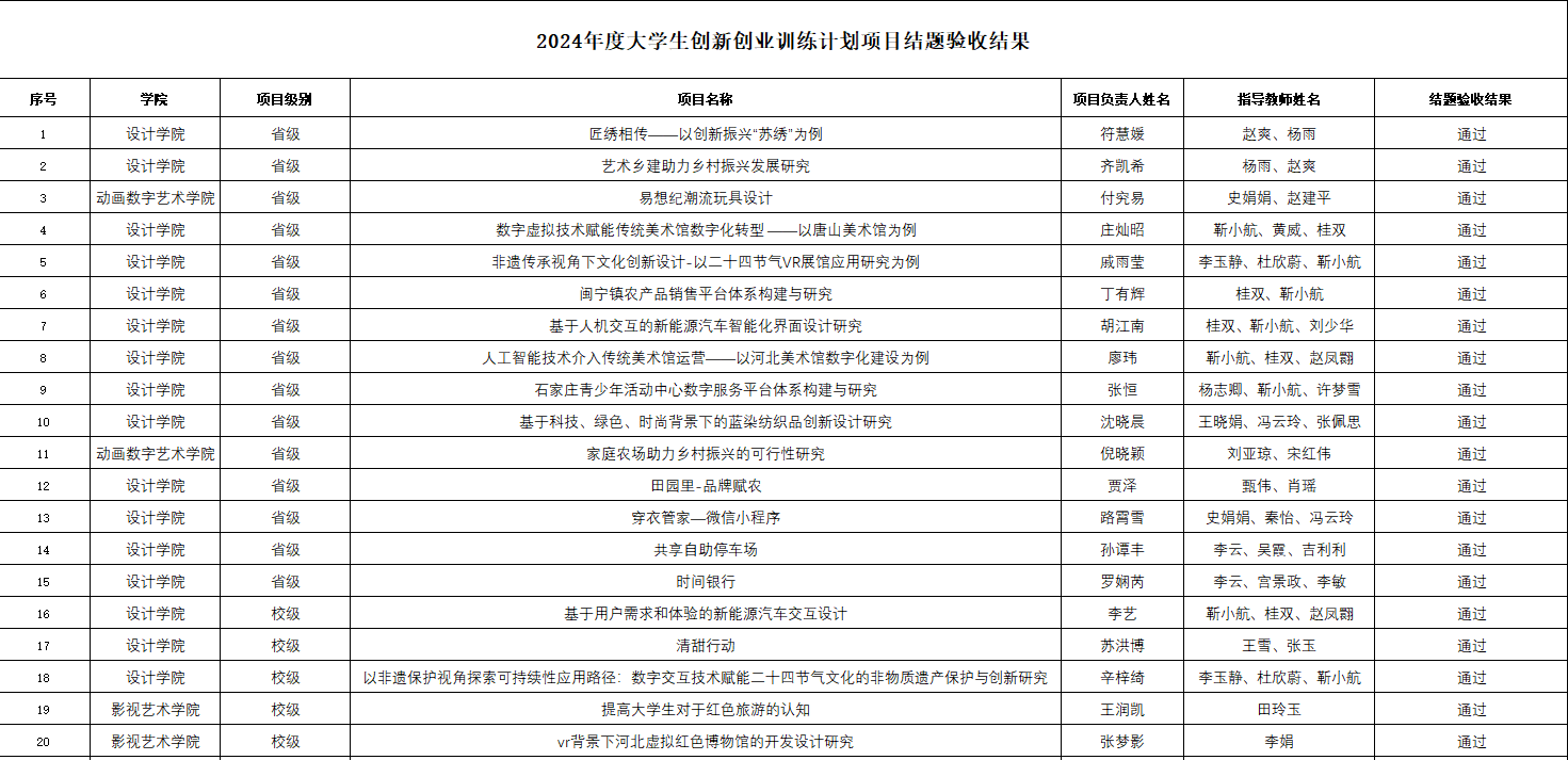 近日,河北省教育厅公布了“2024年度国家级和省级大学生创新创业训练计划项目立项名单和结题验收结果”。经学校遴选、验收、申报和省教育厅审核,我校2023年度大学生创新创业训练计划15个省级立项项目均顺利通过结题验收,2024年度大学生创新创业训练计划项目省级立项20项。