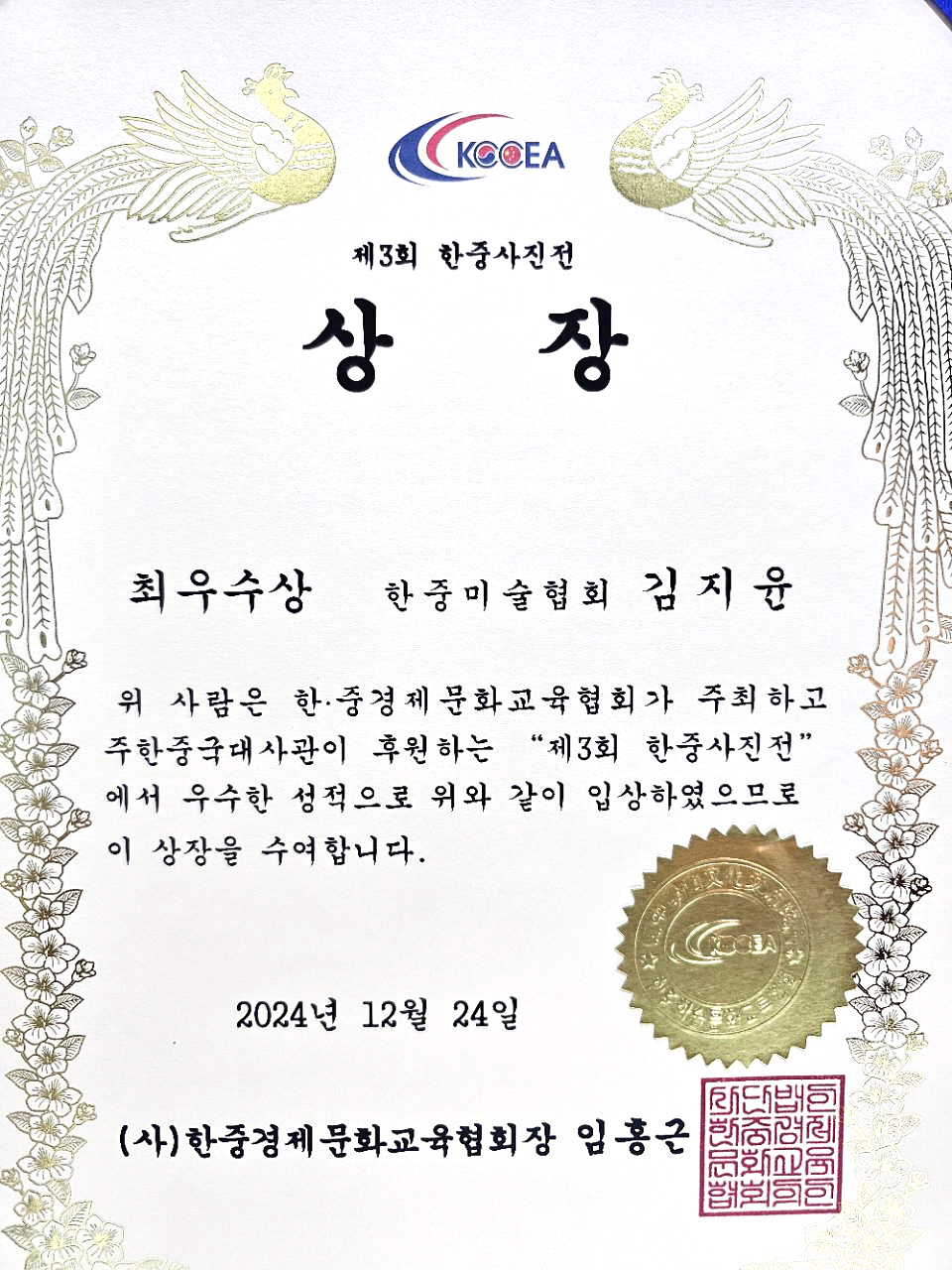 2024年12月23日下午,第三届韩中摄影展开幕式在韩国国会议员会议馆一层大厅举行,本次摄影展由韩中经济文化教育协会主办、中国驻韩国大使馆赞助。在此次展览中,我校韩国籍教授金智润的摄影作品脱颖而出,荣获“最佳优秀奖”。