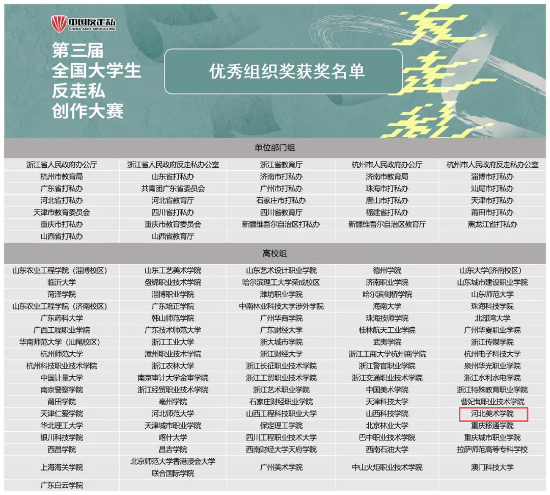 近日,第三届全国大学生反走私创作大赛评选结果公布,我校获得优秀组织奖。影视艺术学院学生夏玎昕、年美伊的作品《迷失的她》,动画数字艺术学院学生魏漫璐的作品《严打走私动物》荣获优秀奖;动画数字艺术学院蔡雨欣的作品《打击走私人人有责》获入围奖。