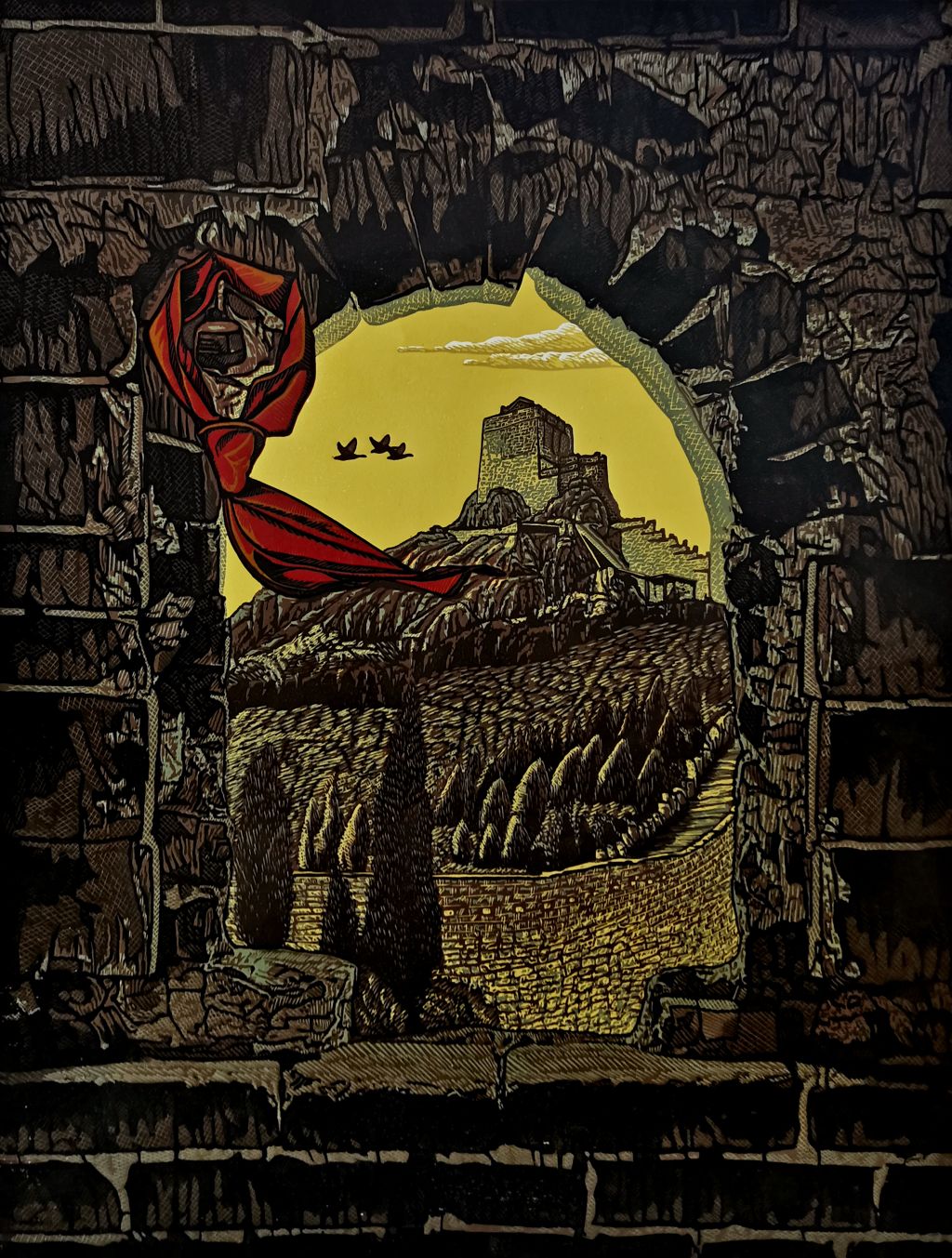 作品简介:作品以套色木刻的形式表现出心中的风景,长城象征着历史的厚重、民族的坚韧与文化的传承。它像一位沉默的守望者,见证着时代的变迁与社会的进步。红领巾与铃铛,承载着几代人的集体记忆。作品中通过对它们的描绘,表达了对过去时代的怀念,以及对青春、理想、信念的追忆。