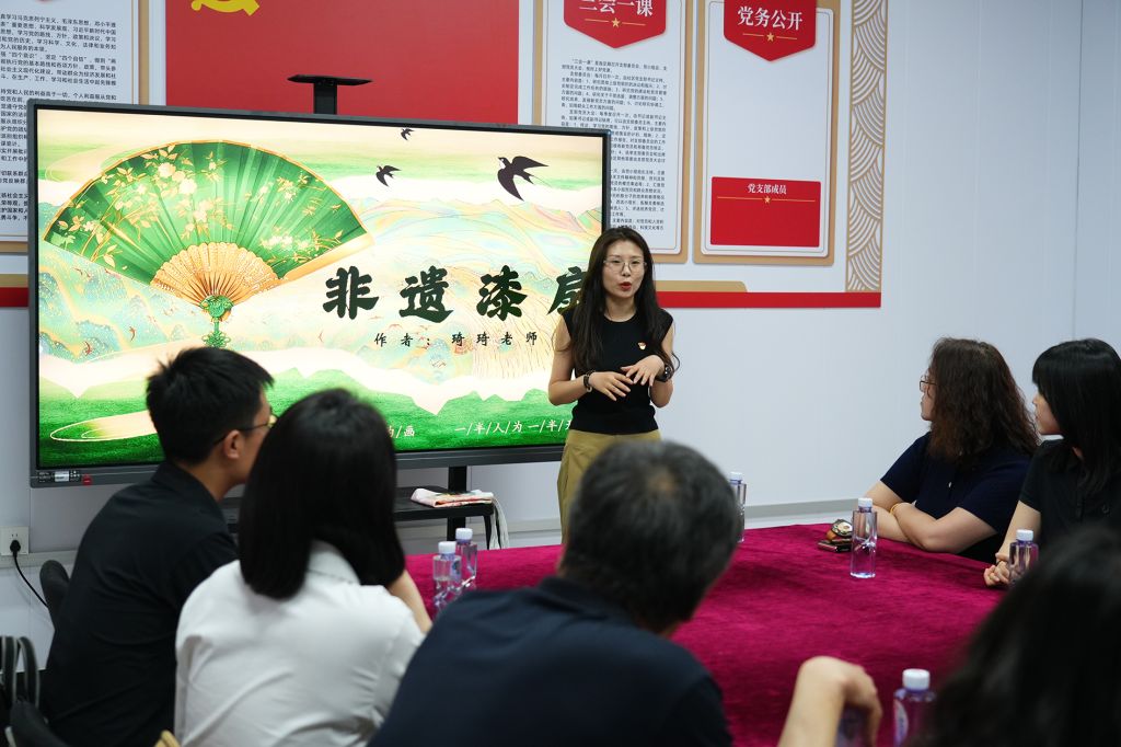 非遗专业教师孟琦详细阐述了中国漆艺的发展史以及非遗保护现状,解析了漂漆技艺中浮色原理、纹样创作等技法原理,并进行现场实践。实践环节融入10 分钟红色微党课,结合非遗作品解读“工匠精神、党员使命与廉洁操守”,让在场人员在欣赏作品的同时,深化党性教育和廉洁文化教育。