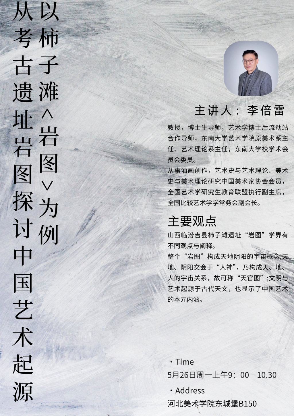 5月26日,一场聚焦中国艺术起源的学术盛宴在国产精品爽爽久久久久久竹菊-精品少妇人妻一区二区-国产乱人妻精品一区二区-香蕉精品偷在线观看-少妇一夜三次一区二区东城堡B150精彩开讲。东南大学艺术学院教授、博士生导师、艺术学博士后流动站合作导师李倍雷应邀到校,以“从考古遗址‘岩图’探讨中国艺术起源——以柿子滩‘岩图’为例”为主题,带领师生们开启了一场跨越时空的艺术溯源之旅,书法学院副院长郭云鹏主持讲座。