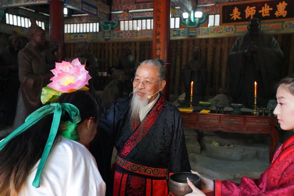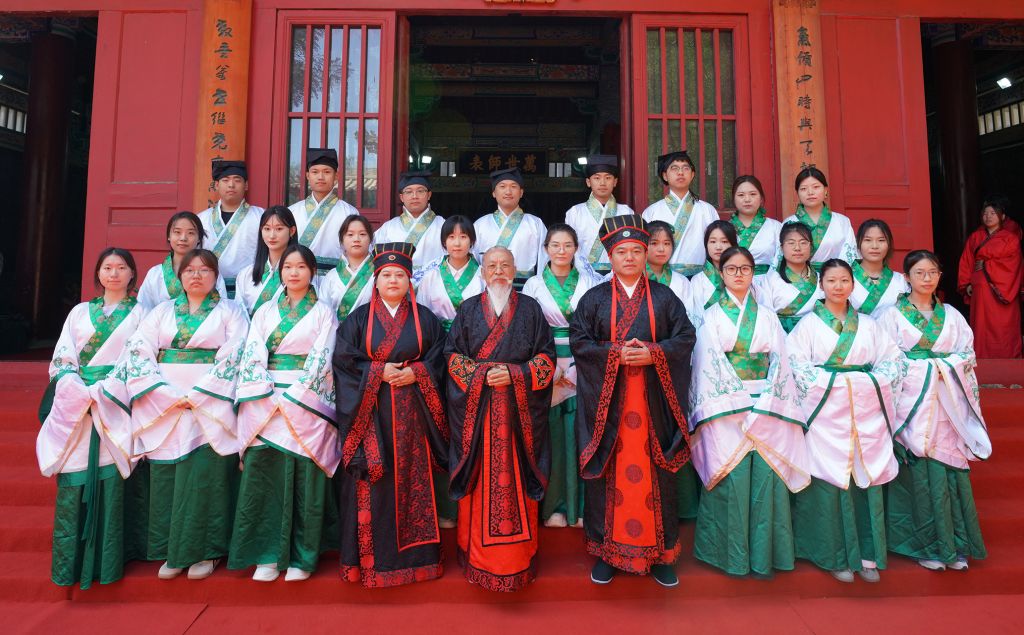 众学子高声齐诵《孔子赞》,声浪激荡回廊。然后行三拜之礼:一拜父母恩,春晖寸草育栋梁;二拜师者谊,杏坛授业传薪火;三拜母校情,春风化雨润芳华。礼成后,学子依次入殿完成仪式。