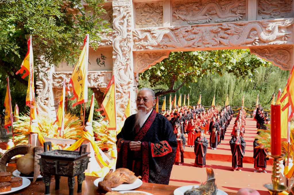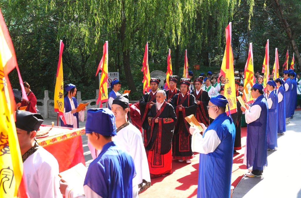汉帜飞扬,鼓乐齐奏。上午8时30分,钟鸣和“启户”声响起,朱门大开,六十四舞者执羽而入,八佾舞翩跹舒展。众师生身着汉服,缓步行至殿前,庄重而立。