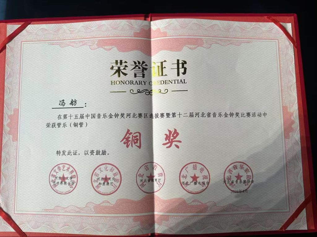 4月23日,第十二届河北省音乐金钟奖表演类赛事在石家庄落下帷幕。经过激烈竞争,我校艺术团喜获佳绩,青年教师冯舫老师荣获管乐(铜管乐)组铜奖,刘凯桐老师获民族弹拨乐组优秀奖,张晨雨老师摘得古筝(青年教师组)优秀奖。其中,冯舫被河北省推荐参加第十五届中国音乐金钟奖全国选拔赛。
