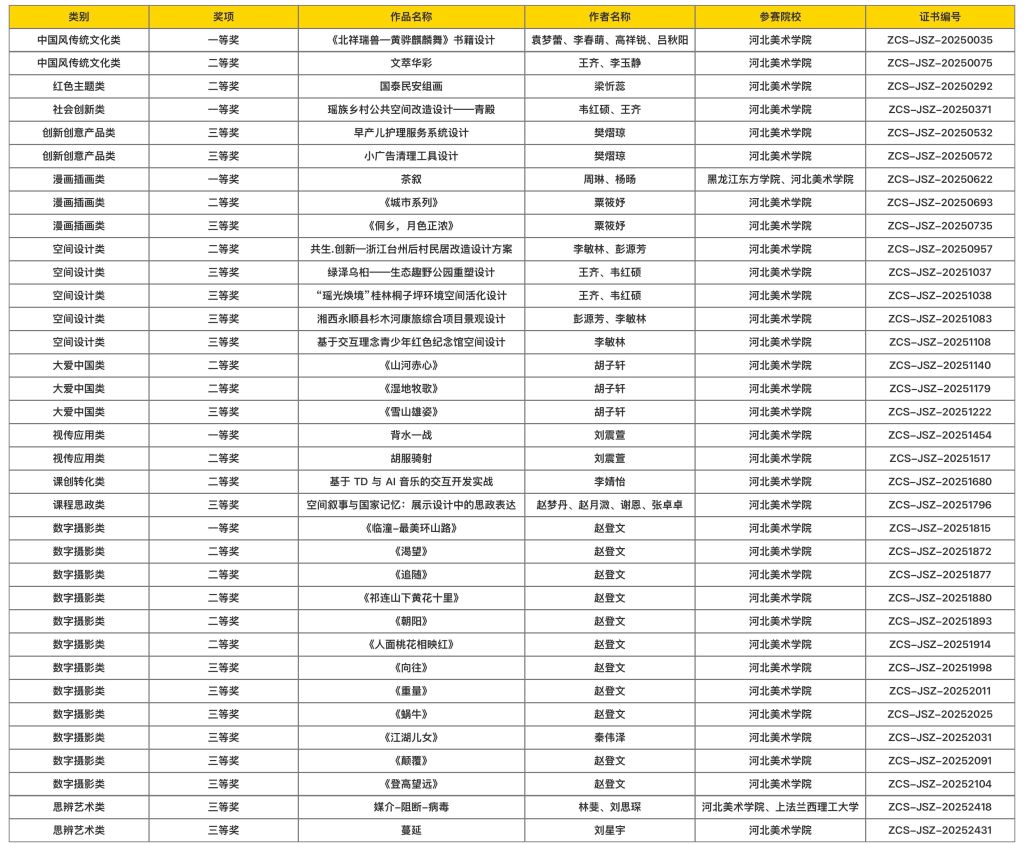本届大赛以“丰富内心世界,创造产业辉煌”为主题,涵盖数字摄影、创新创意产品、视传应用等多个赛道,共吸引全国405所参赛高校。我校师生积极报名参赛,精心打磨参赛作品。经过层层选拔和严格评审,多件作品凭借其独特的创意和精美的制作,在众多参赛作品中脱颖而出,最终取得了优异的成绩。