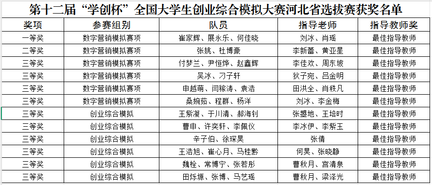 近日,河北省教育厅公布第十二届“学创杯”全国大学生创业综合模拟大赛河北省选拔赛获奖名单。本次比赛我校荣获省级一等奖一项、二等奖一项、三等奖十项。