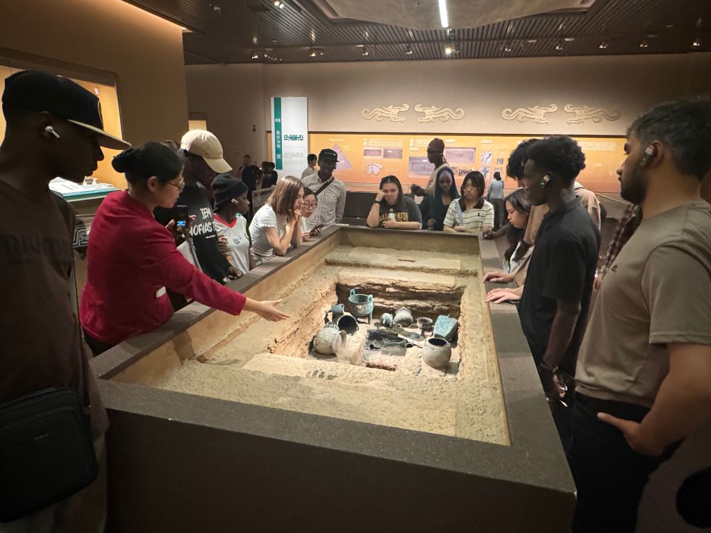 下午,留学生们在英文解说员的引导下走进殷墟博物馆。他们仔细观摩了妇好墓、亚长墓等处出土的文物,一件件精致的青铜器、古朴的陶器、刻有卜辞的甲骨仿佛在诉说着商朝的辉煌与智慧。留学生们表现出浓厚兴趣,频频就甲骨文记载内容、青铜器使用场景等方面向讲解员提问,并得到细致解答,浓厚的探索氛围弥漫在每一个展厅。留学生们第一次深入了解了3000多年前商代社会的政治、经济与文化面貌,被中华文明的博大精深所吸引。