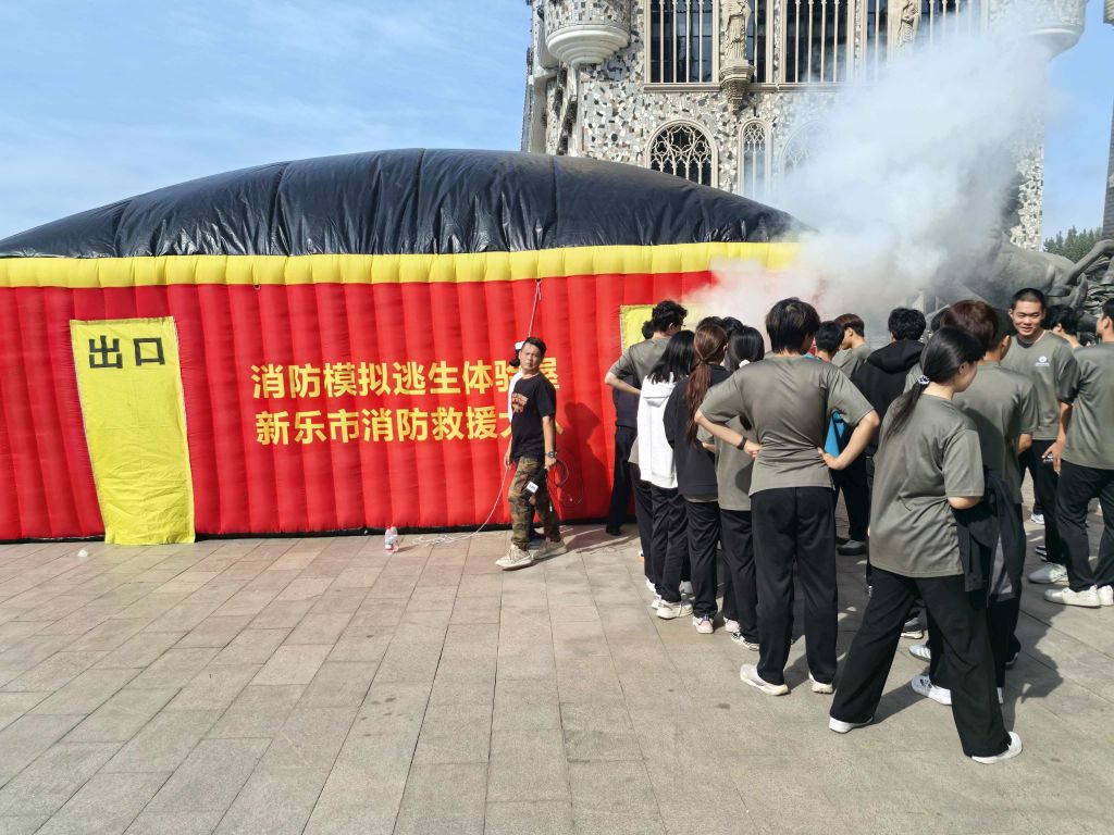 新乐市消防救援大队工作人员现场讲解火灾预防、初起扑救和火场逃生要点,现场示范灭火器、消防水带等器材的正确操作,并组织师生进入移动式演练屋开展沉浸式疏散逃生演练,指导学生切实掌握自救互救技能。