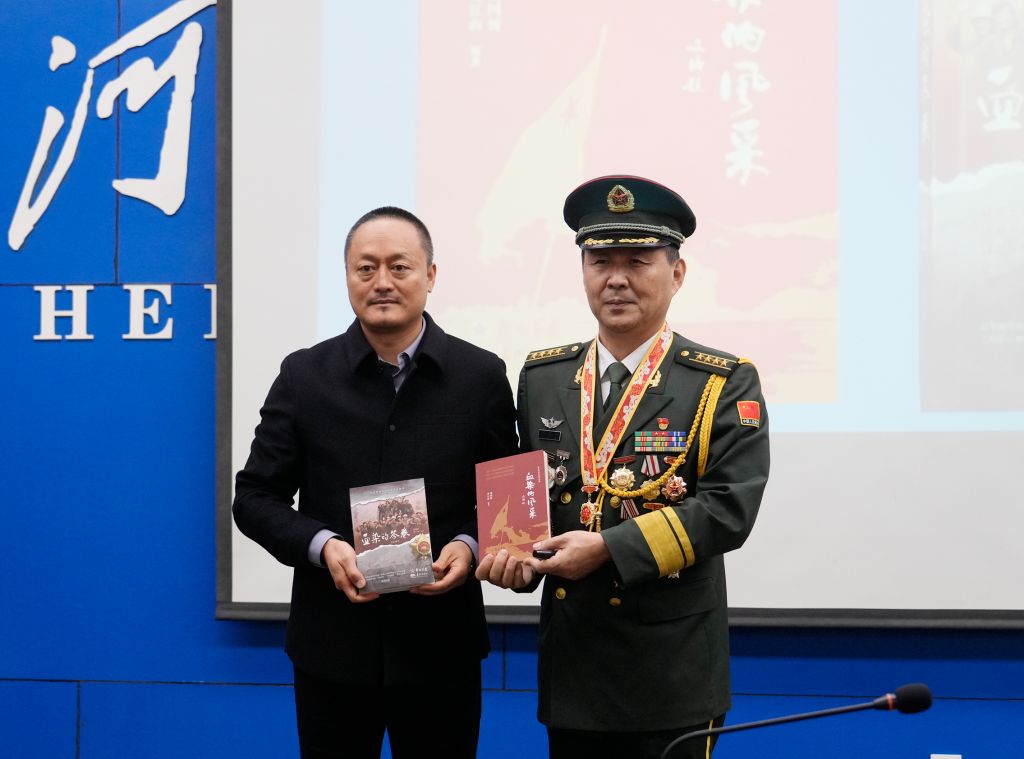 胡国桥以自身经历为切入点,带来了一场饱含深情与力量的爱国主义教育报告。他结合军旅生涯中的奋斗故事与深刻感悟,生动诠释了“爱国”的深刻内涵与“担当”的实践意义,字字铿锵、句句真挚,深深打动了在场每一位师生。报告尾声,胡国桥向学校赠书,以红色书籍为载体传递红色文化,勉励学子“把英雄精神写进人生剧本”。