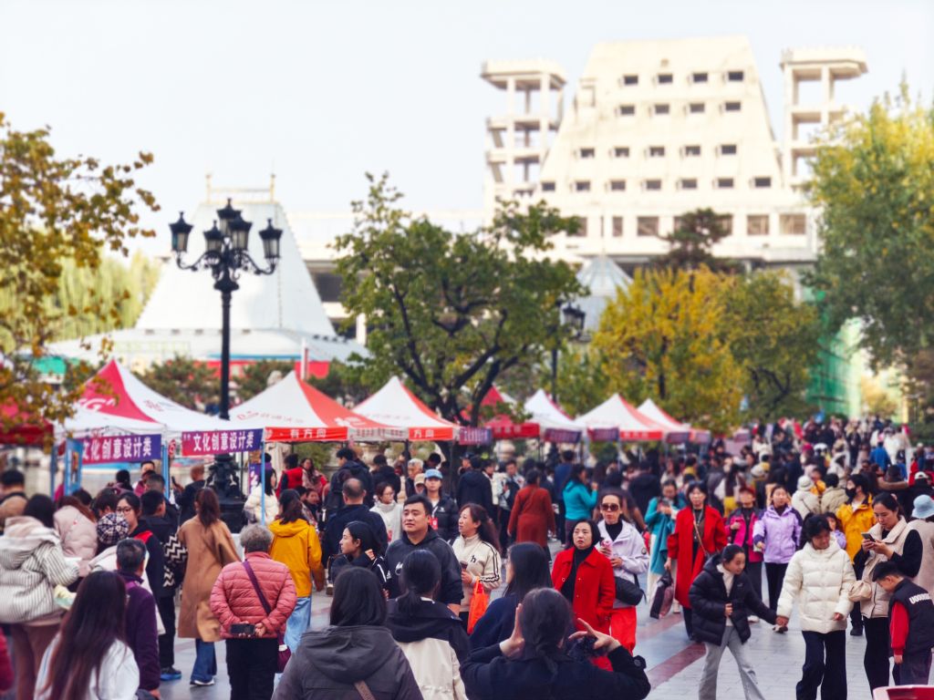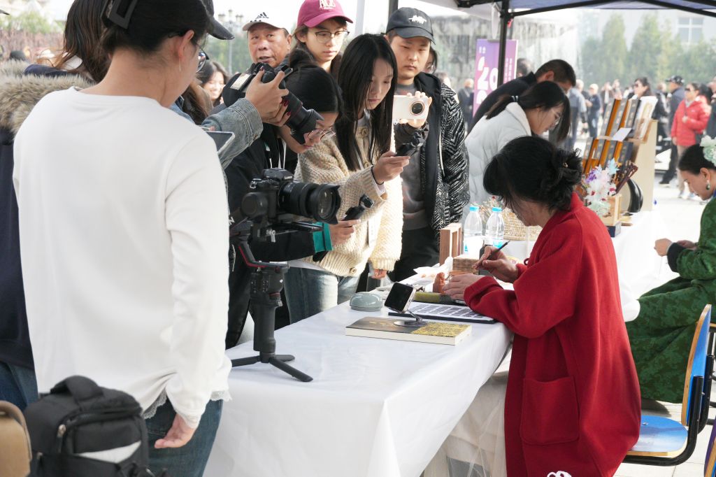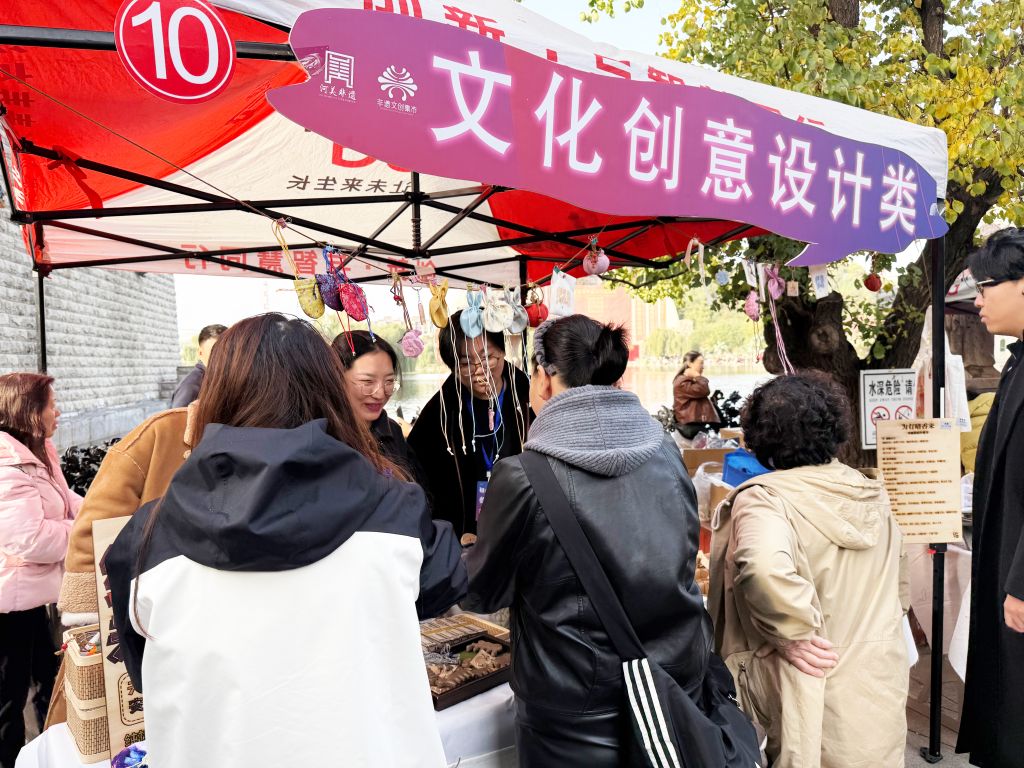 市集现场,百余个特色展位沿湖铺展,形成一道传统技艺与青春创意交相辉映的文化长廊。非遗展区匠人云集,技艺展演引人入胜;文创展区作品纷呈,学生原创IP形象、文创礼品等备受青睐,部分作品开展不久即告售罄,充分体现了非遗创新产品的高接受度与市场潜力。