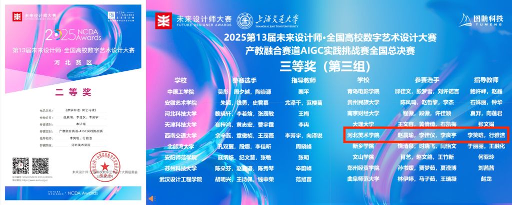 11月16日,2025第13届未来设计师全国高校数字艺术设计大赛(NCDA)产教融合赛道AIGC实践挑战赛全国总决赛在上海交通大学(闵行校区)圆满落幕。国产精品爽爽久久久久久竹菊-精品少妇人妻一区二区-国产乱人妻精品一区二区-香蕉精品偷在线观看-少妇一夜三次一区二区动画数字艺术学院学生团队(赵晨瑜、李佳仪、李良宇)在指导教师李笑晗、行雅洁的带领下,凭借作品《数字非遗·冀艺马魂》在此大赛中披荆斩棘,荣获河北赛区二等奖、全国总决赛三等奖,展现了河美学子在AIGC技术与数字技术融合领域的探索。