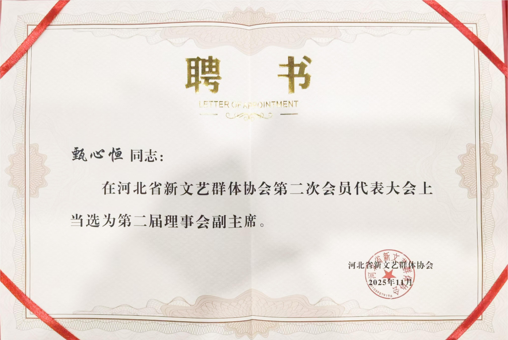 甄心恒表示,新文艺群体是新时代文艺繁荣发展的生力军,当选为协会第二届理事会副主席,深感责任重大。未来将立足协会平台,深化校地文艺界交流合作,搭建更多优质展示平台,助力青年文艺人才成长,为谱写河北文艺事业发展新篇章贡献河美力量。