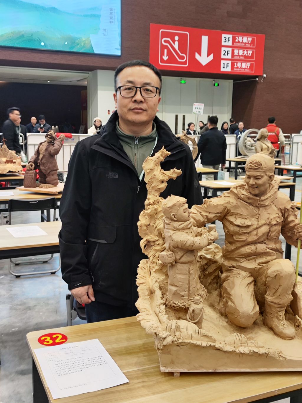 在实操环节中,王昭辉老师沉着发挥,将传统陶瓷雕塑技艺与现代审美理念深度融合。他运用拍、捏、塑、挖、压等多种技法,以140余斤陶泥现场创作了作品《温暖的草方格》。该作品以精巧的构图、鲜明的主题和细腻的人物刻画,生动呈现了孩童为治沙工人送热水的温情场景,既体现了治沙人的坚守与奉献,也寓意着绿色希望与科技精神的代际传承。作品以其深刻的文化内涵和艺术感染力,赢得了评委的高度认可。