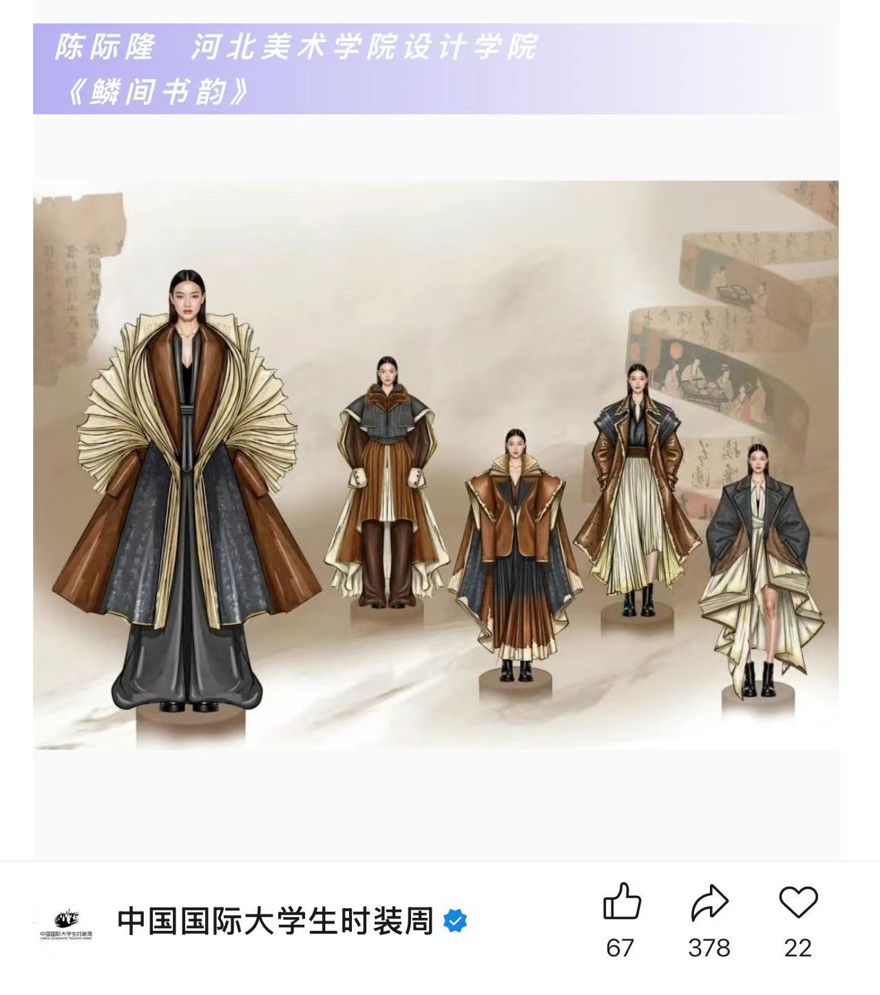 1月30日,第31届中国时装设计新人奖初评工作在北京圆满举行,并于2月4日在中国国际大学生时装周等行业权威公众号公示。设计学院服装与服饰设计专业陈际隆同学凭借《鳞间书韵》设计作品成功入围终评,即将在5月举办的中国国际大学生时装周期间角逐最终奖项。