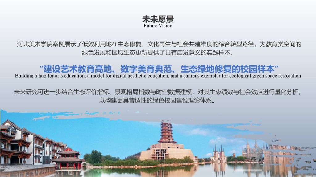 在建设实施过程中,通过蓝绿基础设施构建、校园水系重塑、绿地系统扩展与地形顺应式整治,实现了建筑、绿地与水体的协同组织。相较建校初期,校园绿地面积增加276.75亩,增长26.4%;建筑面积增加约9.58万平方米,增长13.7%;水体面积增加218.85亩,增长19.6%,校园整体空间结构与生态格局得到显著优化。同时,项目将地域文化表达与国际艺术语境融入空间结构与景观系统,推动校园由低效荒置用地向复合型生态教育空间的整体转型,在生态修复、空间品质提升与公共文化价值塑造等方面取得显著成效。
