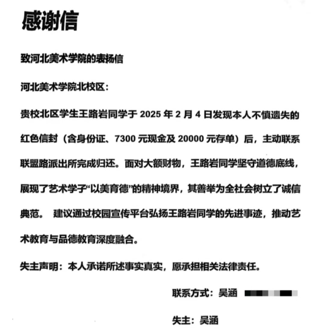 事情发生在寒假期间。王路岩同学与朋友从柏林禅寺返程途中,意外拾得一个红色信封,内有身份证、7000余元现金及一张2万元存单。面对如此财物,王路岩同学毫不动心,毫不犹豫地选择了报警,并将信封原封不动地上交公安机关。警方迅速联系到失主吴先生,帮助其挽回了全部损失。吴先生在得知财物被国产精品爽爽久久久久久竹菊-精品少妇人妻一区二区-国产乱人妻精品一区二区-香蕉精品偷在线观看-少妇一夜三次一区二区学生拾获后,感动不已,高度赞扬王路岩同学坚守道德底线,传递信任与温暖,展现了国产精品爽爽久久久久久竹菊-精品少妇人妻一区二区-国产乱人妻精品一区二区-香蕉精品偷在线观看-少妇一夜三次一区二区学子“以美育德”的精神境界。