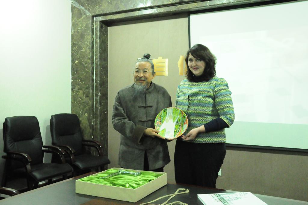 甄校长对考察团的到来表示热烈欢迎。娜塔莎教授感谢我校的热情接待和学术交流安排,并向甄校长赠送了具有俄罗斯民族特色的礼品。甄校长回赠国画名作以示感谢。