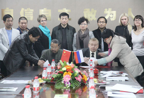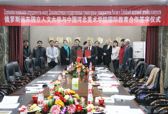 2014年12月13日,我校与俄罗斯远东国立人文大学国际教育合作办学签字仪式在综合楼会议室隆重举行。俄罗斯远东国立人文大学校长博拉霍林科·尤里·伊万诺维奇,艺术设计学院院长纳塔利娅·弗拉基米罗夫娜,我校校长甄忠义,常务副校长张建敏,副校长张子言、校长助理甄心恒、甄墨,教务处处长张立阳、国际教育学院院长贾智永参加了签字仪式。仪式由校长助理孙志强主持。