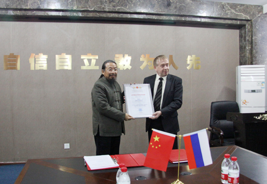在签字仪式上,尤里校长向甄忠义校长颁发了俄罗斯远东国立人文大学终身教授聘书;甄忠义校长向尤里校长颁发了我校终身教授聘书,向纳塔利娅院长颁发了我校客座教授聘书。在双方领导互赠礼物后,甄校长和尤里校长分别代表我校和俄罗斯远东国立人文大学在合作办学协议上签字。