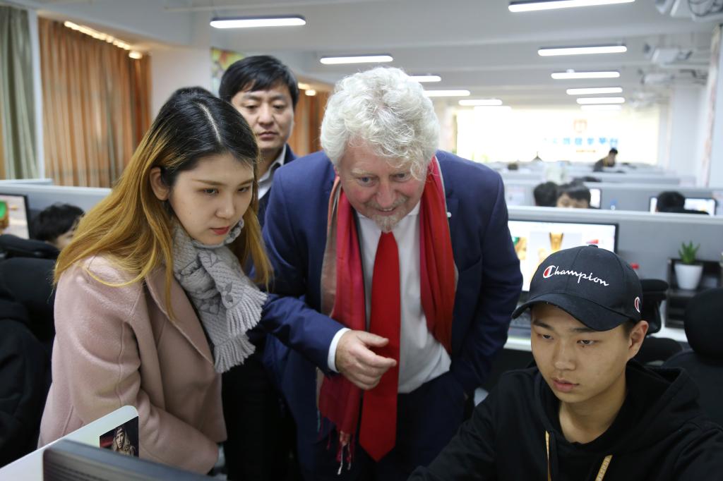 菲茨帕特里克院长参观了动画学院的实训室,还与学生就动画技术提升方法展开热烈讨论,并对我校人才培养模式表示赞赏。动画学院教研主任安志龙对授课模式进行细致讲解。