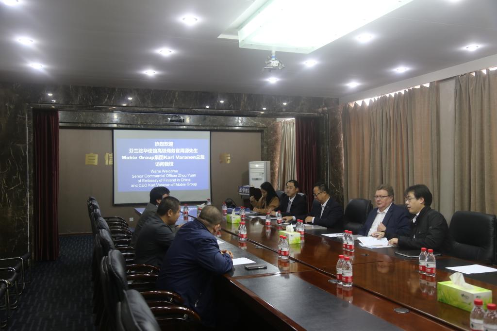 2018年10月18日下午14时,芬兰驻华使馆高级商务官周源先生以及茂邦集团Kari Varanen总裁一行来访我校,常务副校长张建敏、校长办公室主任麻立峰在沙盘会议室会见来宾,国际教育学院副院长曹海飞、国际交流与合作中心副主任郝金龙陪同。