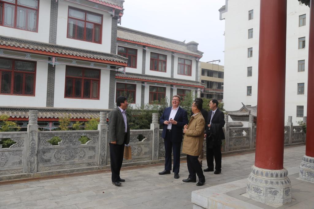 周源先生一行对学校进行了实地考察,对富有中国特色的古建筑表示出浓厚的兴趣,对学校优美的校园环境表示震惊。
